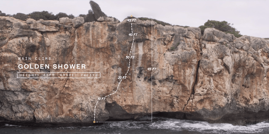 - Grades – The rating that indicates the difficulty of the climbing route. Grades are subjective and vary by discipline and location/region. (It’s confusing and kind of a nightmare. I often look up conversion charts but they’re still just best guesses.) For example, the first main climb in episode one is a deep water solo route called Golden Shower which has a grade of 7A (French) or 5.11d (North American/Yosemite Decimal System).