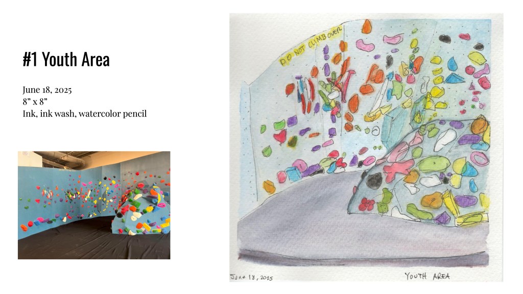 This first one was mostly done pretty quickly while another coach led a game. One of the kids asked me if I was drawing them, and I proudly said no, that I was editing everyone out of the painting. Later after the kids left for the day, I took a pic to finish sketching and filling in the climbing holds at home.