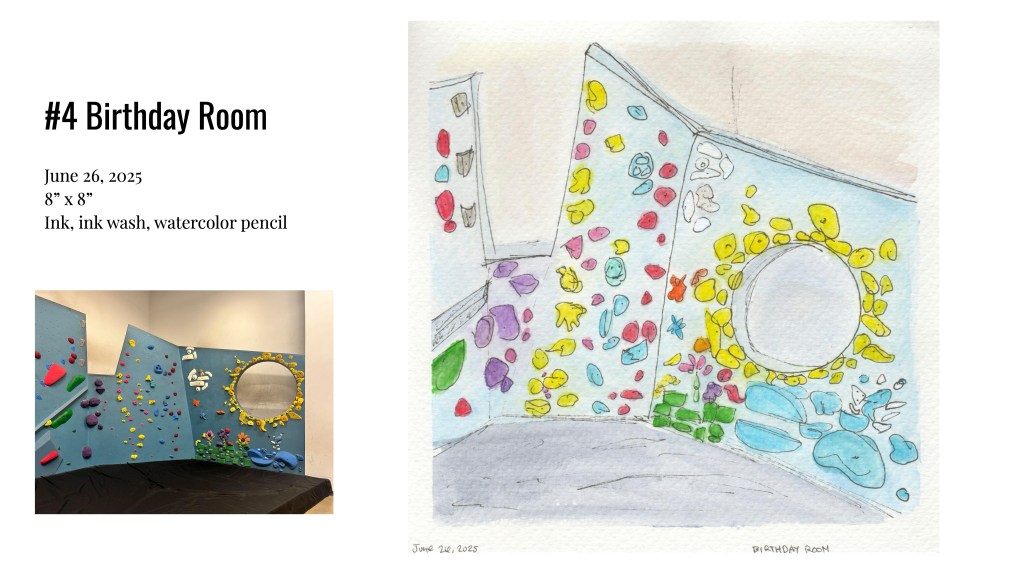 I started mixing colors for each climbing hold and quickly realized that was going to take forever, so I switched to watercolor pencils. I’m not a fan of the look. But overall, I’m pretty pleased with how this turned out considering the chaos around me.