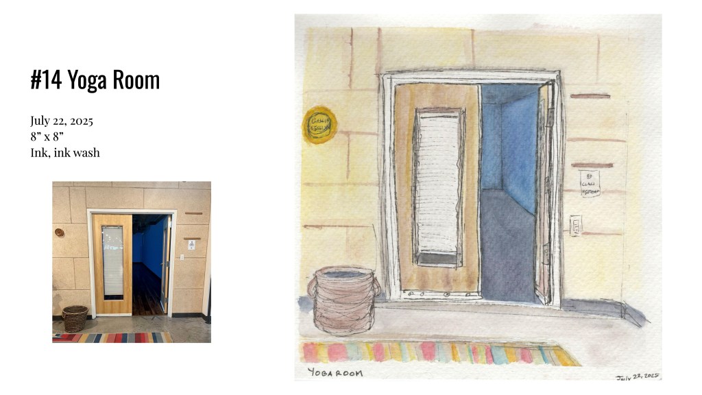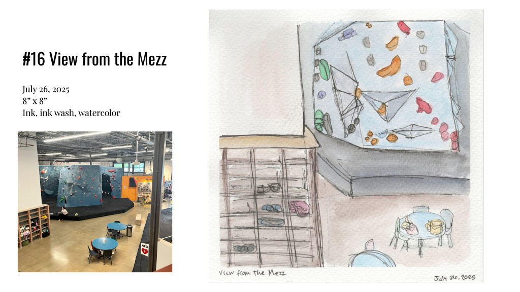 I think it was the bold orange of the ladder that caught my eye first, then the chalk prints on the mat and the walls. Then I saw an opportunity to practice depth with color and the amount of details I included in the sketch.