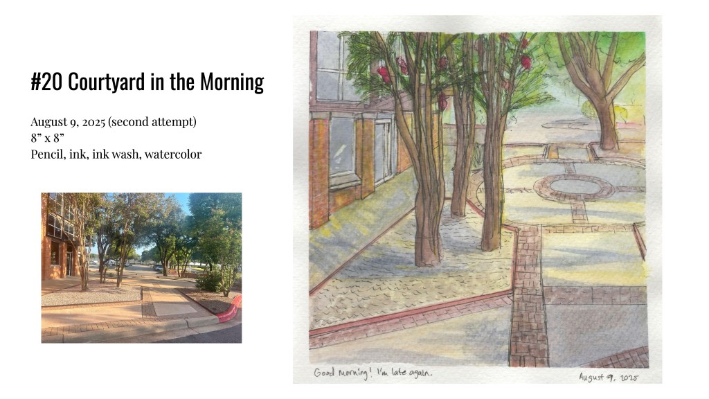 Iโd been eyeing this wall all summer because the morning sunlight made this area look a little golden. And I wanted to practice trees and shadows too.