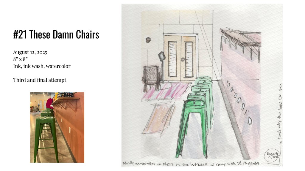 This was my third โ and final โ attempt at drawing the chairs. There are some pretty obvious lines in the wrong spots because thatโs just how it turned out. But I kind of like it anyway?