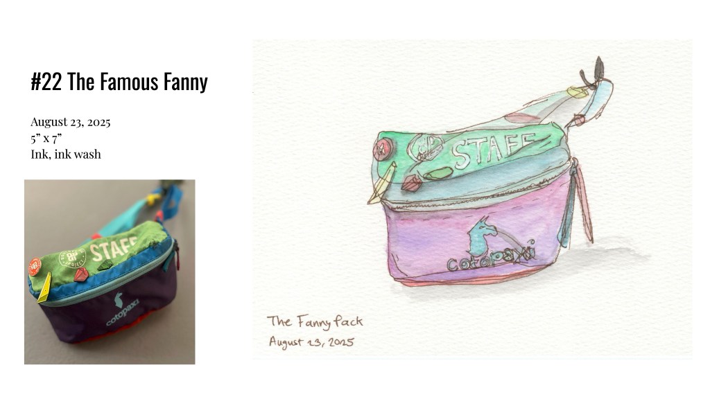 We have a โlaunch stationโ by our door that leads to our garage, which is where I put everything I need to bring with me when leaving my house. Itโs a shelf with several hooks to accommodate my object impermanence. Anyway, I was in the mood to sketch at home, and I think I was walking back into the house after walking my dog and just thought they looked cool hanging there. I used my white gel pens for the lines on the shoes and chalk bag.